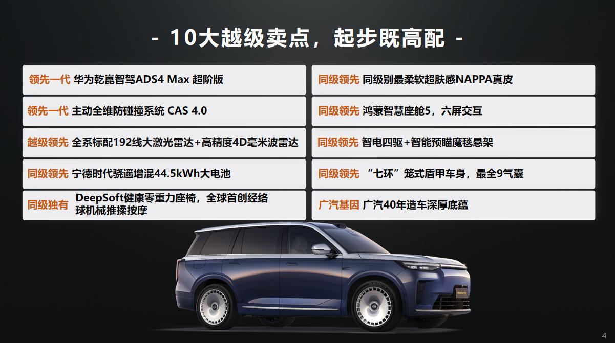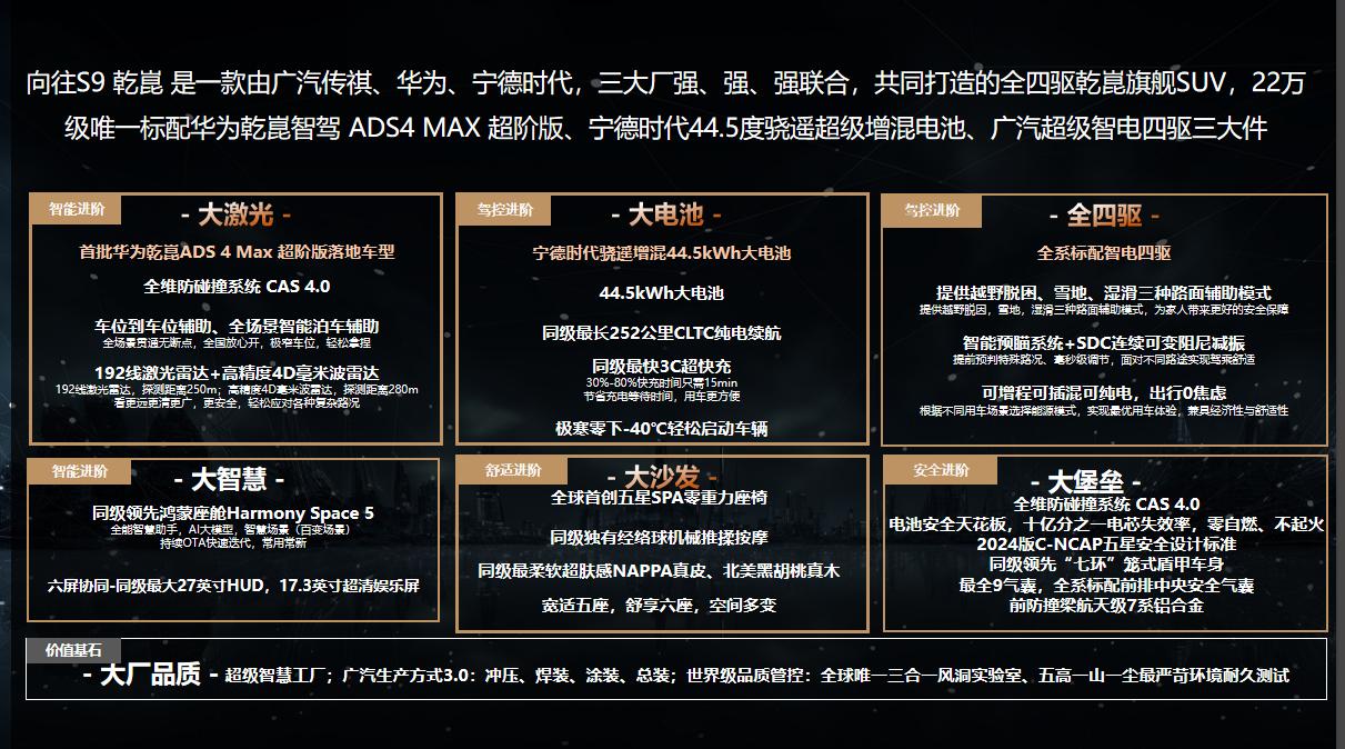 传祺向往S9乾崑为幸福大家庭而来,作为广汽传祺旗下的家庭智能旗舰SUV,搭载华为乾崑智驾ADS 4 Max超阶版、宁德时代44.5度骁遥超级增混电池、广汽超级智电四驱等核心科技,主打“超舒适的华系SUV”标签。