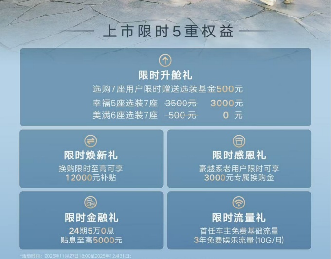 此次第三代豪越L共推出4款配置车型,官方指导价区间为9.99-12.99万元,叠加上市限时优惠,起售价下探至8.99万元,以空间、智能、动力的全维升级,打破10万级B级燃油SUV市场格局,为全球大家庭用户提供高价值出行解决方案。新车上市,自然少不了限时权益,接下来,我将为大家公布专属礼遇来袭。